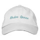 In Weiß mit blau besticktem Text abgebildete Kappe.