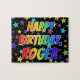 This fun, lively, birthday-themed jigsaw puzzle design feature the message "HAPPY BIRTHDAY, ROGER" with the characters having a colorful rainbow spectrum inspirred gradient pattern, along with a vibrant stars background pattern. A colorful puzzle like this might be used to send a birthday greeting message to somebody named Roger. [~ Z0000468]