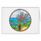 Un paysage et un wapiti dans un cadre de bordure circulaire. Ce puissant wapiti a cultivé des arbres comme bois. Il est debout en regardant au-dessus de sa forêt de collines et de plans d'eau. Copyright © 2017 Kimberly J Tilley.