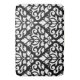 Rolle- und Blattdamast in einem Vintagen Artmuster, mit weißem Detail über einen schwarzen Hintergrund.