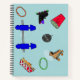 Ein phantastisches Notizbuch mit Quad-Skaten, Inline-Skaten, einem Softdrink mit gemahlenem Eis, Gelee-Armbändern, Fußball, Diskokugel, Nachos, einem Skaten-Fußboden mit Lichtflecken und einem vermissten Chip an der Oberfläche.