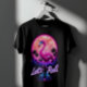 Ein Flamingo-Roller mit Sonnenbrille unter einem Neonond mit Palmen
