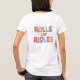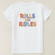 Dieser lebendige T - Shirt zeichnet sich durch die Phrase "Rolls and Riddles" in einem spielerischen, farbenfrohen Design aus. Das Wort "Rolls" wird in einem fett gerundeten Schriftart mit einem Farbverlauf von warmen Farbtönen dargestellt, wobei der Übergang von Rot zu Gelb erfolgt