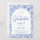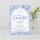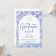 An elegant graduation celebration design featuring a delicate blue toile floral border inspired by classic European porcelain and vintage botanical prints. The intricate florals frame a clean arched center panel, creating a refined and timeless composition that highlights the graduate’s name and event details beautifully. Soft blue tones against a crisp ivory background give the design a sophisticated yet celebratory feel. Perfect for a stylish graduation gathering with a classic, romantic aesthetic.