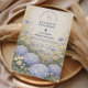 A romantic wedding design featuring lush dusty blue hydrangeas paired with soft ivory roses and delicate meadow blossoms. The florals frame the layout in a graceful, symmetrical garden composition accented by subtle classic detailing. Set against a warm parchment background, the palette feels refined, timeless, and effortlessly elegant. Perfect for a sophisticated celebration with a soft blue botanical aesthetic.