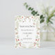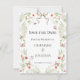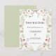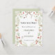 This save the date card features a soft, romantic botanical design with a delicate, vintage-inspired feel. The front showcases a symmetrical floral wreath composed of airy white blossoms, soft greenery, and subtle accents of red berries, creating a light and elegant frame around the centered text. Charming details like butterflies and tiny ladybugs add a whimsical, nature-inspired touch, while a flowing taupe ribbon bow at the top enhances the graceful aesthetic. The typography is classic and refined, with a mix of serif fonts that give the piece a timeless wedding style. The back complements the front with a coordinating soft sage green background, offering a clean and understated finish that ties beautifully into the botanical palette. The overall design is perfect for a romantic garden or nature-themed wedding, blending elegance with a hint of rustic charm.