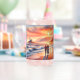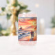 A dreamy coastal scene unfolds at golden hour, where a couple strolls along the shoreline beneath a glowing sunset and a distant lighthouse. Soft pastel skies blend coral, peach, and warm amber tones with rolling ocean waves, creating a tranquil, romantic atmosphere. The painterly style feels whimsical and cozy, evoking cottagecore and coastal folk aesthetics with a gentle sense of wander and togetherness. AI generated artwork.