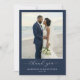 This elegant thank you card features a stunning beach photograph framed by a deep navy blue border, creating a serene and romantic atmosphere. The design includes sophisticated typography with a cursive "thank you" at the top, followed by customizable name and date placeholders in classic serif and sans-serif fonts. Perfect for weddings or formal events, this card combines realistic photographic elements with refined aesthetics to convey gratitude and celebration.