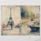 Romantische Parisienne Junk Journal Page. Auf beiden Seiten sind verschiedene Kunstwerke zu sehen, die den Pariser Lebensstil darstellen, mit romantischen Paaren, Cafés, Fluss- und Eiffelturm-Szenen. Mit einem Vintagen Gefühl. Für Ihre Junk Journaling- und Scrapbooking Projekte.