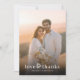 This wedding thank you card features a romantic and elegant design with two individuals standing close together against a warm, golden sunset background. The color palette is dominated by soft oranges, yellows, and beiges, creating a serene and affectionate mood. The layout centers on the figures, complemented by floral motifs in creamy white and gold tones, enhancing the timeless aesthetic. Delicate serif typography reads "love & thanks" at the bottom, paired with customizable names in a clean sans-serif font, making it perfect for expressing gratitude after a heartfelt celebration.