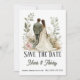 Verkünden Sie Ihren besonderen Tag mit dieser atemberaubenden Save The Date-Karte mit einer warmen botanischen Szene und einer romantischen Braut-und-Bräutigam-Illustration.