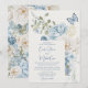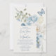 Romantische Dusty Blue Watercolor Blühende Hochzeitseinladungen mit dustig blauen Zeleste- und Delphinium-Blume mit Eukalyptusgrün und Schmetterlingen. Fügen Sie Ihren eigenen Text in elegantem, modernem Kalligrafieschrift hinzu. Für Sie entworfen von Evco Studio www.zazzle.com/store/evcostudio
