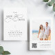 Dieses romantische Skript Ankündigung Datum freihalten Karte ist perfekt für eine einfache Hochzeit. Das minimalistische Schwarz-Weiß-Design zeichnet sich durch eine elegante und romantische Kalligraphie-Schrift mit QR-Code auf der Rückseite aus. Für eine weiter gehende Anpassung dieses Designs klicken Sie bitte auf den BUTTON BLAU DESIGN TOOL oben!