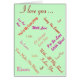 Die Vorderseite dieser romantischen Valentinenkarte ist mit verschiedenen Worten der Liebe "I Liebe you "In Liebe" "Loving you" und andere kurze Botschaften für den lass jemand Besonderes, wie viel Sie sie Liebe. Die Nachrichten werden in verschiedenen Goldtönen auf einem weichen, grün leuchtenden Hintergrund gedruckt. Die Karte ist nicht geschlechtsspezifisch, daher kann sie an einen Freund, eine Freundin oder einen Ehemann, eine Ehefrau, einen Liebhaber geschickt werden, sie ist sogar für jeden geeignet, mit dem man in Liebe ist. Es gibt eine kurze Nicht-Rhyme-Meldung in der Karte, die leicht für Ihre eigene Lieblingsnachricht personalisiert werden kann.