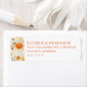 Dieses Rücksendeetikett verfügt über ein romantisches und vintage-inspiriertes Design mit einem weichen pastellfarbenen Blumenmuster auf der linken Seite, das in einem Wassercolor-Stil in Orangetönen, Gelb, Grün und Beige gehalten ist. Die rechte Seite zeigt eine elegante, korallenrote Serifenschrift, die für Namen, Adressen, Orte und Daten anpassbar ist und Ihren Korrespondenzen eine persönliche Note verleiht. Die ausgewogene Komposition kombiniert zarte Blumen mit sauberem Text und schafft eine Atmosphäre der Wärme und Nostalgie, die perfekt ist, um Hochzeitseinladungen oder besondere Anlässe mit Charme zu versehen.