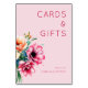 Dieses Hochzeitstisch-Schild hat einen sanften rosa Hintergrund, der mit einer Wasserfarben-Blumenanordnung in Pfirsich-, Korallen- und Hellblautönen geschmückt ist. Das Design enthält elegante Typografie, wobei "CARDS & GIFTS" oben in fetter Serif-Schriftart prominent dargestellt wird, während "thank you" darunter in einer leichteren, kursiven Schriftart geschrieben ist. Die Gesamtoptik ist romantisch und zart und perfekt, um sich an Ihrem besonderen Tag dankbar zu zeigen. Die ausgewogene Komposition und die harmonische Farbpalette schaffen eine warme und einladende Atmosphäre und machen es zu einer idealen Ergänzung für jede Hochzeitsfeier.