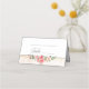 Ein hübscher Haufen von eleganten Aquarellrosen und Pink-Blättern auf einem subtilen pastellfarbenen Aquarellhintergrund, vergoldetes Etikett und eine benutzerdefinierte "Table" Textgrafik in einem formalen Skript-Schriftart mit Zeilenelementen für Gästenname und Tischnummer.