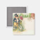 Adorable Vintage Abbildung eines Schweins in einem oberen Hut, das auf einem Fahrrad fährt und einen Strauß Blume an seine Freundin trägt, die über eine Mauer schaut und einen hübschen Ventilator hält