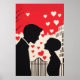 Ein visuell auffälliges Kunstwerk, das eine romantische Szene mit einem silhouetted Paar darstellt, das sich anblickt. Der Hintergrund zeigt einen strahlend roten Himmel, der mit schwebenden weißen und roten Herzen gefüllt ist, mit schwarz-weißen Gebäude und einem nackten Baum, was auf eine städtische Umgebung hindeutet. Der künstlerische Stil ist kühl, modern und minimalistisch und betont die Liebe und Verbindung zwischen den beiden Figuren.