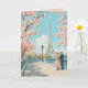 Ein wunderschön illustriertes Reiseplakat im Stil der 50er Jahre, das ein romantisches Paar darstellt, das unter blühenden Kirschblüten mit dem Eiffelturm im Hintergrund spaziert. Die Pastelltöne und die Retro-Ästhetik lassen den zeitlosen Charme des Frühlings in Paris erkennen.
