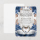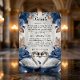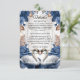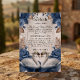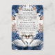 Ergänzen Sie Ihre formelle Einladung mit diesem "Something Blue"-Einleger, der romantische Schwäne und vintagehafte Blumenelemente für eine zeitlose, elegante Ästhetik enthält. Dieses Design zeigt ein Paar illustrierte Schwäne, die einander zugewandt sind und so Hingabe symbolisieren, umrahmt von einer üppigen Anordnung von Wasserfarben-Blumen. Die Farbpalette verwendet tiefe Navy- und staubige Blautöne von Rosen, die gegen warmes Taupe und erdige braune Blätter kontrastiert werden. Diese Elemente sind vor einem weichen cremefarbenen Hintergrund gesetzt, der optisch das Aussehen von gealtertem Pergament oder Velin simuliert. Die Typografie kombiniert eine schwungvolle, formelle Kalligrafieschrift für die Überschrift mit einer traditionellen Serifenschrift für den Fließtext, um eine hohe Lesbarkeit zu gewährleisten. Bitte beachten Sie, dass es sich hierbei um ein