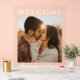 Dieses Hochzeitsschild zeigt ein warmes, intimes Foto von zwei Personen in einer engen Umarmung, gerahmt von fetten Textelementen. Das Design verwendet eine Farbpalette aus weichen Brauntönen und Beigetönen mit goldenen Sonnenlichtakzenten, wodurch eine romantische und einladende Atmosphäre entsteht. Die Typografie umfasst große, einladende "WILLKOMMEN"-Buchstaben oben, elegante Schrift für die Personalisierung und eine klare Serifenschrift für zusätzliche Details. Perfekt zur Feier von Liebe und Einheit, kombiniert dieses Schild fotografischen Realismus mit grafischer Schlichtheit, um Wärme und Feierlichkeit zu vermitteln.