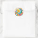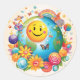 Un autocollant en cercle coloré avec une planète heureuse conçu par Happy Planet Events
