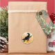 Silhouette noire d'une sorcière qui s'envole dans le ciel sur son balai pris dans la lueur de la nuit d'Halloween. Un autocollant parfait à utiliser pour vos cartes d'Halloween, invitations et sacs cadeaux de fête.