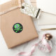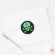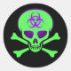 Un autocollant noir avec un crâne et des arêtes croisées à symbole vert et violet.