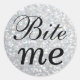 Ce sticker super mignon "mordre moi", fait un grand accessoire pour tout apéritif, dessert ou service alimentaire. L'arrière - plan de cet autocollant est une illustration photo et aucune parties scintillant réelle n'est utilisée.