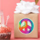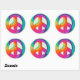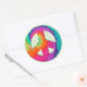 Autocollant rond avec l'image d'un symbole de paix psychédélique aux couleurs vives sur vert clair. Voir collant vinyle taillé sur mesure, confetti, sac de faveur, ballotin, étiquette de faveur, sacs cadeaux, étiquette et papier d'emballage. Voir toute la collection Disco les années 70 Sticker dans les INVITATIONS | Section Stickers & Étiquettes.