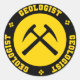 Autocollant jaune et noir avec marteaux rocheux croisés entourés de "GEOLOGIST" en lettres collégiales.