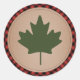 Un autocollant illustrant l'illustration d'une feuille d'érable verte au-dessus d'un arrière - plan inspiré par un stock de carte avec une bordure rouge et noire. Recherchez les invitations correspondantes chez Jill's Paperie.