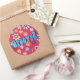 Autocollant rond avec le mot-clé "Super!" des années 60 sur une image vintage des années 60 de fleurs jaunes, bleues, orange et violettes sur le rouge. Voir sac de faveur, ballotin, étiquette de faveur et étiquette correspondant. Voir l'ensemble de la collection Psychedelic Sticker des années 60 dans les INVITATIONS | Section Stickers & Étiquettes.