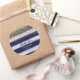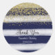 Autocollant rond pour la fête d'anniversaire avec design parties scintillant or et bleu marine rayures arrière - plan.