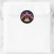 Autocollant noir avec tonneau stylisé aux couleurs de coucher de soleil orange, rouge et violet.