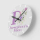 Horloge De Chambre Enfants. Le design présente Monogram & Name avec Fleurs de chaque côté dans un style pastel couleur eau. L'exemple de nom est Persephone. Horloge Des Enfants. Changez le nom comme souhaité pour toute personne ayant un nom commençant par P.