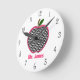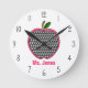 Une horloge pour les enseignants avec une illustration d'une pomme en pied de jambe. Personnalisez avec le nom de votre professeur en rose.