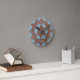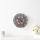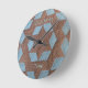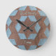 "Quilting Time" est un texte imprécis en haut et en bas de la face de l'horloge. Bloc de courtepointe en motif "château" marron et bleu. Le "château" central est en forme d'étoile marron, entouré par le "mur 6 côtés" avec les "tours de guet" s'étendant du milieu des murs. Les points du "mur" marquent les positions 1-12 sur l'horloge.
