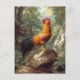 Ein gewagtes und farbenfrohes Gemälde eines Hahners, das stolz in einer üppigen Dschungellandschaft stehend ist und den Charakter eines Bauernhofs mit einer wilden tropischen Umgebung verbindet.