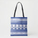 Diese Tote-Tasche hat ein lustiges nautisches Design mit Ankern, Seilen und Streifen in blau auf einem weißen Hintergrund.