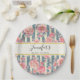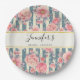 Brautparty-Papier-Teller mit einem wunderschönen Muster mit hübschen rosa Blume überlagert über einem gestreiften Muster, das aus blauen und cremefarbenen Streifen besteht. Ein Rechteck mit einem Imitat mit einem goldenen Rahmen, der oben mit dem personalisierten Text überlagert ist.