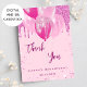 Pastellrosa Hintergrundfarbe. Mit rosa Imitaten Glitzer, Glitzern, pastellrosa und heißen rosa Ballons. Auf der Vorderseite große Hand Schrift und der Text: Danke. Zurück: Personalisieren Sie Ihre Dankeschön Notiz und Name. Der Name ist mit einem modernen handgeschriebenen Stilskript geschrieben.