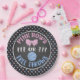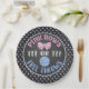 PapierParty-Teller für ein themed Geschlecht des Basketballs deckt auf. Rosa-Bögen und blaue Freiwürfe.