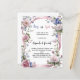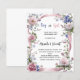 Ein eleganter weißer Hintergrund mit rosa und blauen Wildblumen und einem rosa Band. Personalisieren und fügen Sie Namen und Party-Details hinzu. 1 Blatt = 1 Einladung mit Druckkante bis Kante.