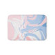 Eine abstrakte Badematte in Rosa, Blau und Weiß.