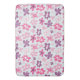 Eine Badematte mit niedlichem Blumenmuster. Besteht aus rosa und lila unregelmäßigen Blume in einem Retro-60er-Groovy-Stil. Oft verblasste kleine blaue Herzen, pfeffern Sie den Hintergrund auf einem blass blauen Hintergrund.