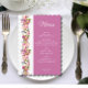 Entspannen Sie bei einem Hochzeitsempfang mit diesem atemberaubenden, rosa, floralen Hochzeitsmenü. Freuen Sie sich auf zarte Aquarellblumen in sanften Rosa und einen eleganten Schriftart für eine zeitlose, romantische Touch. Ideal für den Garten, Vintage oder klassische Hochzeitsthemen, wird dieses Menü Ihre Tischumgebung wunderbar ergänzen und Ihre Gäste beeindrucken