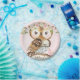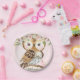 Geburtstagsfeier mit süßen Eule-Themen, auf dem eine Uhu in Aquarellfarbe auf rosa Hintergrund steht.