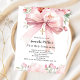Weiß, mit einem rosa großen Bogen und goldfarbenen Kreuz und rosa Blume dekoriert. Personalisieren und fügen Sie einen Namen und Details. 1 Blatt = 1 Einladung mit Druckkante bis Kante.
